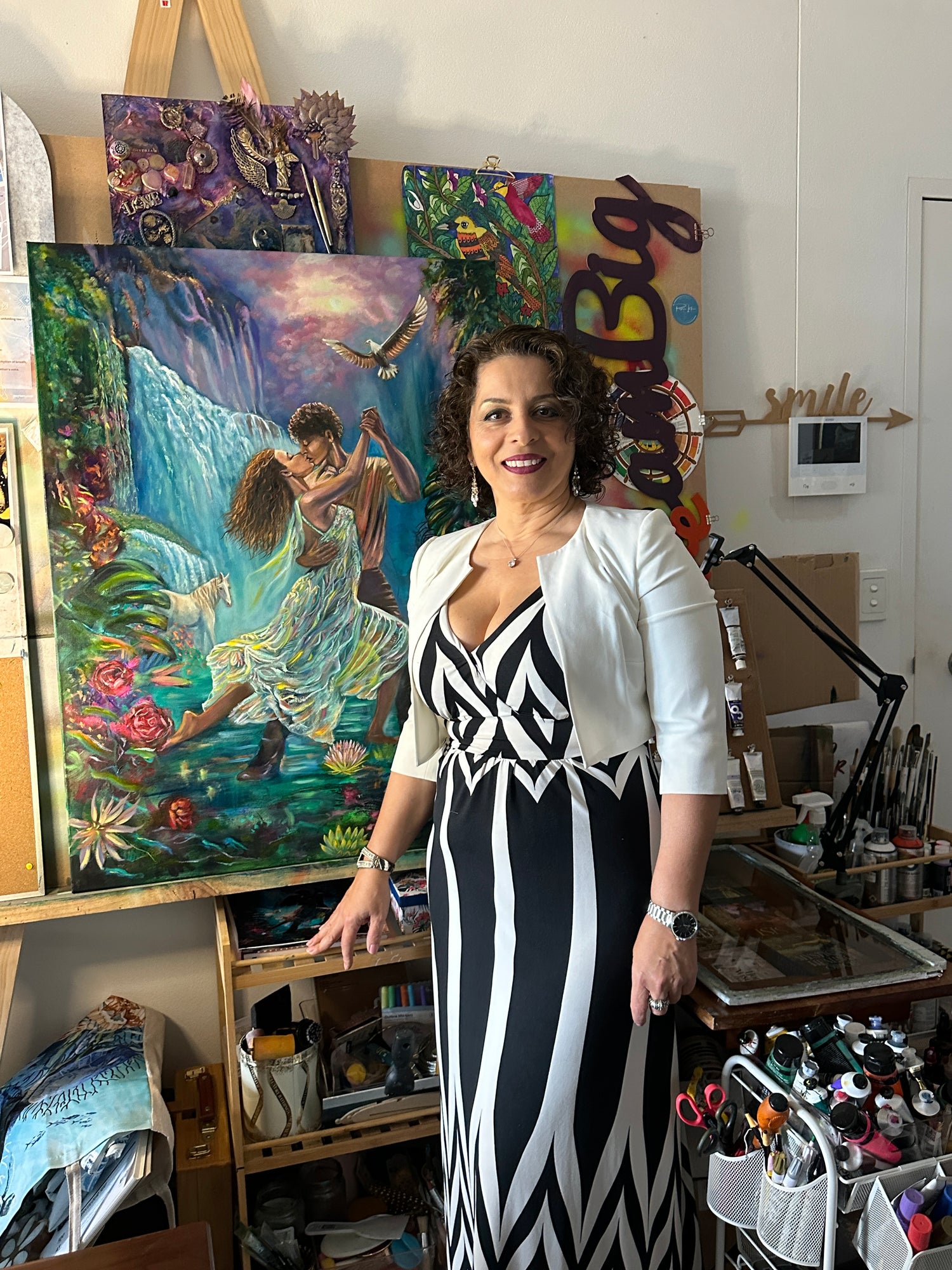 Beyond her incredible talent, Popi’s dedication to both her art and her career as a psychologist has deeply inspired me to embrace my own creativity. Her artwork now hangs in my massage clinic, and every time I walk in and sit in the wall, I feel an immediate connection to my true self. It reminds me to stay authentic, to keep creating, and to honor my own artistic path. After years of setting my creative dreams aside, I am now making music, working on my own oracle deck (which Popi will illustrate), making lifestyle videos, and fully stepping into my artistic flow.